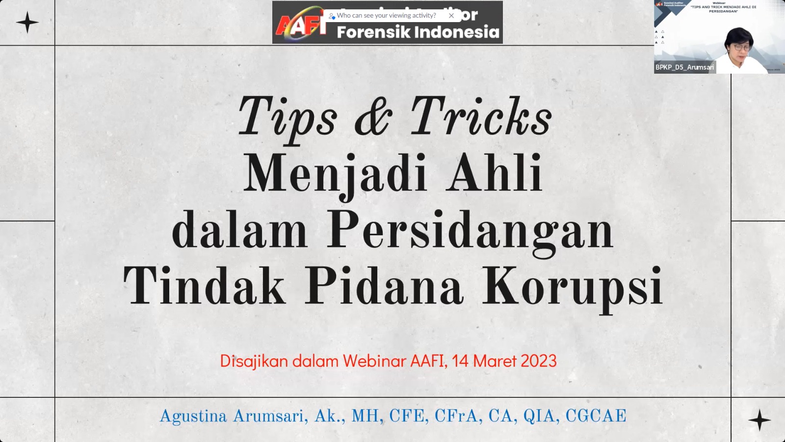 Terkait hal itu, AAFI LANGKAT menggelar webinar bertajuk Tips and Tricks Menjadi Ahli di Persidangan yang menghadirkan Ibu Agustina Arumsari, Ak., M.H., CFE, CFrA, CA, QIA, CGCAE (Deputi Investigasi BPKP) sebagai Narasumber dan Ibu Dr. Selvia Vivi Devianti S.E., M.Sc., MCP., Ak, CFrA, CFE, CSFA (Direktur Litbang BPK RI) selaku Moderator.�